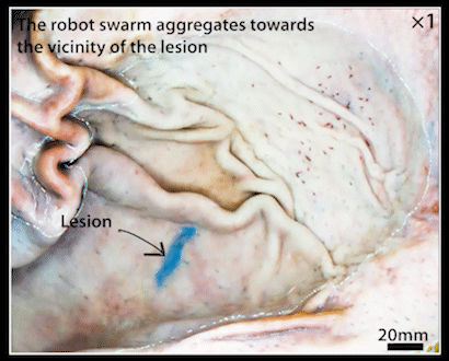 灵活的微型仿鱼磁性软机器人集群向病灶聚集并形状自适应贴附